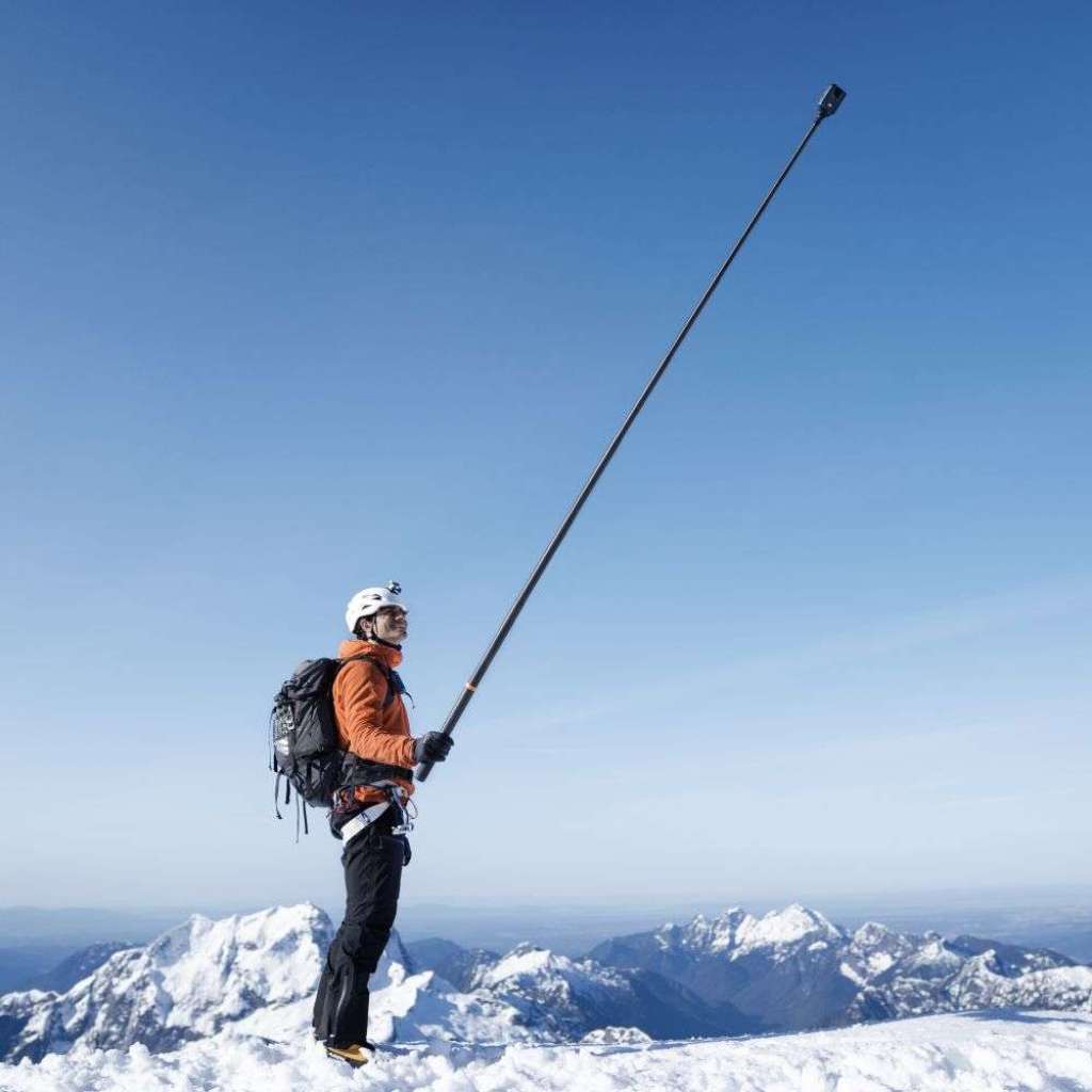 Extra dlouhá karbonová tyč se vysune až na 2,5 m a v obraze Osmo 360 zcela zmizí. Umožní boční záběry s dronovým efektem, přesto zůstává lehká, pevná a spolehlivá i při svižné akci.